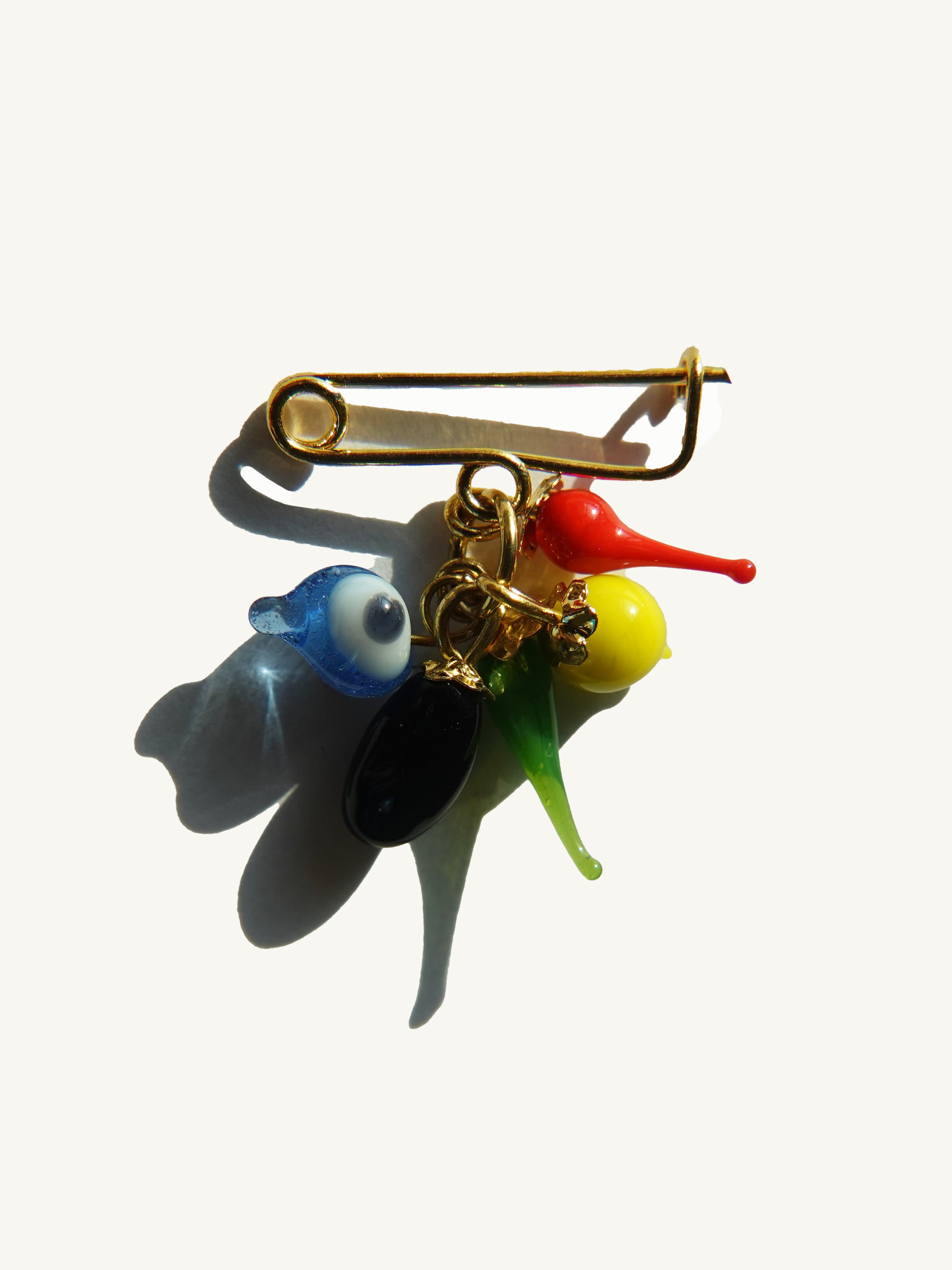 Vintage Nazar Brooch with Nazar (Evil Eye), Tomato, PEpper, Lemon, Aubergine in glass. Original item from 1970's in limited numbers.